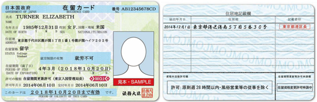 「在留卡」是對中長期僑居者之上陸許可及在留資格之變更許可,在留卡具有“證書”性質,證明法務大臣已許可其本人持有在留資格及在留期限可合法在日本中長期逗留。 在留卡上記載有姓名、出生年月日、性別、國籍、地區、居住地、在留資格、在留期限、可否就業等法務大臣所掌握的重要事項,記載事項發生改變時,應履行變更事項的申報義務,確保在留卡上的資訊為最新。16歲以上者的在留卡上應有本人照片。 取得在留資格並領取簽證,赴日當天在成田機場、羽田機場、中部機場及關西機場,在護照上加蓋上陸許可印章後,會由海關人員直接將在留卡片發給本人。 於上述機場及港口以外入境的人員,在護照上加蓋上陸許可印章後可至居留者位在的市區町村窗口進行居住地申請,並領取在留卡片(原則上由地方入國管理局郵寄到該居住地) 詳細有關在留管理制度,可以上日本入國管理局官方網站查詢: https://www.immi-moj.go.jp/newimmiact_1/index.html